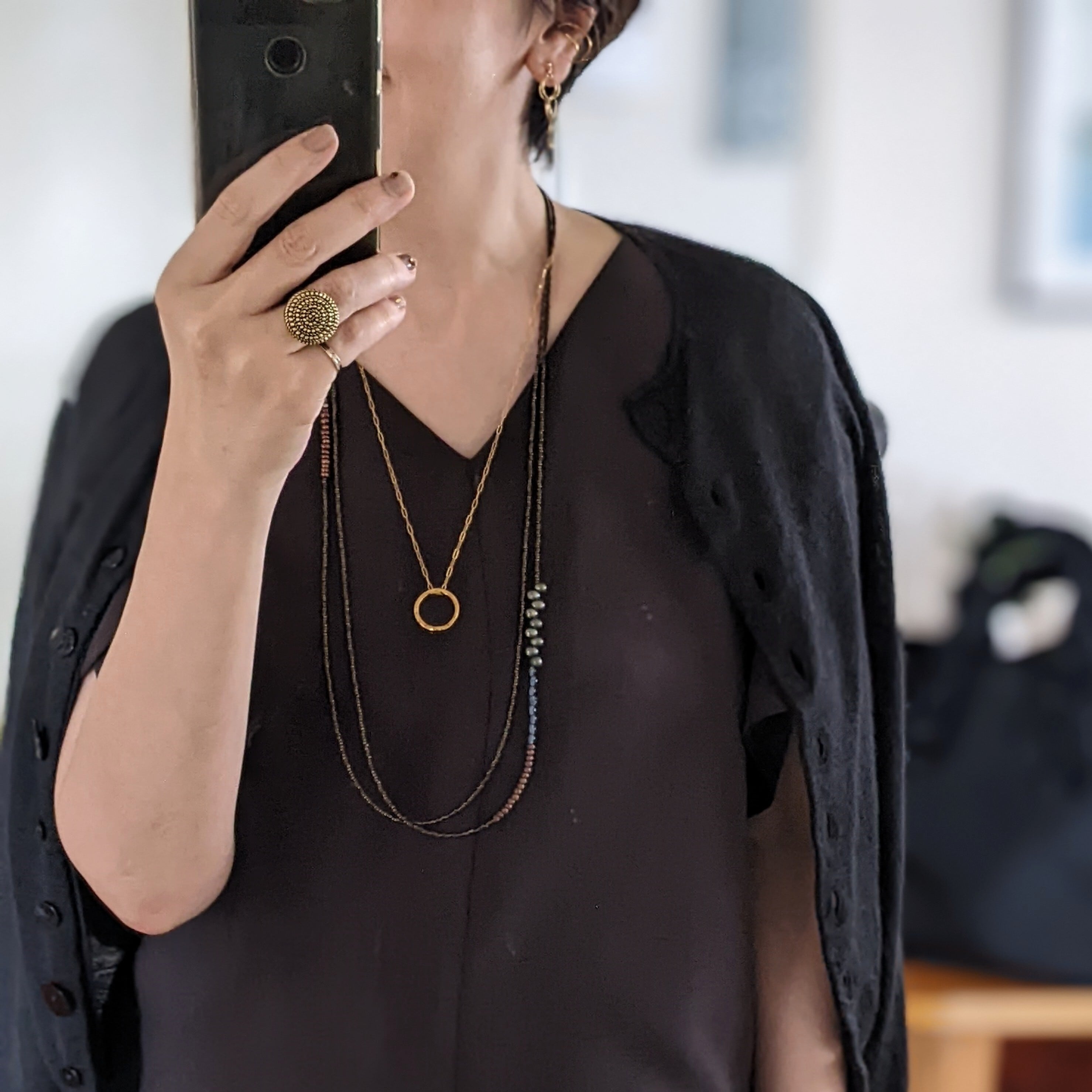 晩夏の始まりに纏う秋色グラデーション。まだ夏素材の洋服の軽やかさに調和する繊細さとさりげない存在感が印象的な2連のロングネックレスです。